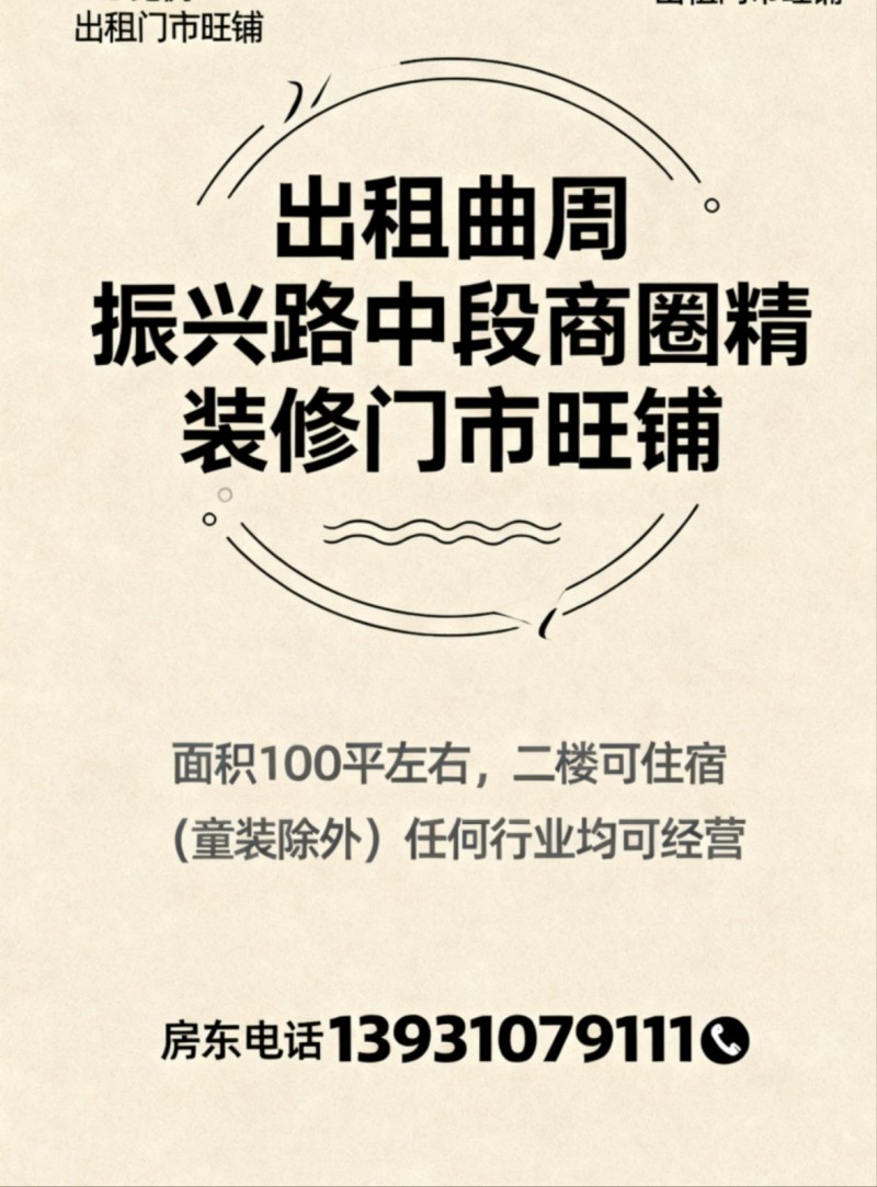 出租曲周振兴路中段商圈精装修门市旺铺出租,面积100平左右!二楼可住宿!(童装除外)任何行业均可经营!